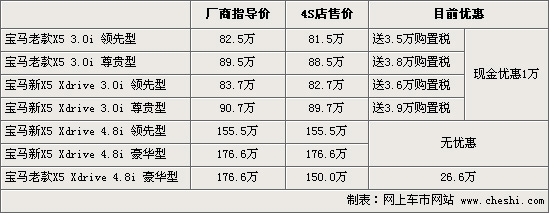 筆者從寶馬北京地區(qū)經(jīng)銷商處了解到,近日寶馬重磅推出了“四重購(gòu)車禮的”新春購(gòu)車促銷活動(dòng),其中有一項(xiàng)是送車輛購(gòu)置稅,針對(duì)車型包括X5在內(nèi)。據(jù)介紹,從2月1日到3月31日期間購(gòu)買X5的客戶可以贈(zèng)送50%的車輛購(gòu)置稅,其中包括了新老款共四款車型,但只針對(duì)3.0排量。新X5尊貴型3.0排量最高送近4萬(wàn)元的購(gòu)置稅,購(gòu)車同時(shí)3.0排量還將有1萬(wàn)元左右的現(xiàn)金優(yōu)惠。而目前老款X5豪華型1.8排量還有少量現(xiàn)車,當(dāng)前最高優(yōu)惠可達(dá)到26.6萬(wàn)元。4S店內(nèi)有黑色和銀色的現(xiàn)車供應(yīng),消費(fèi)者可到店咨詢具體行情。