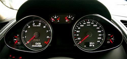 儀表板內(nèi),轉(zhuǎn)速表與時速表表底分別為9,000rpm與 350km/h,顯現(xiàn)R8傲人的性能實力;除了基本的油量表與水溫表外,電壓表和機油溫度表等輔助儀表,也是常見性能車型的儀表組合。