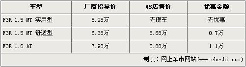 據(jù)比亞迪汽車北京地區(qū)4S店銷售人員介紹,比亞迪F3R全系均有優(yōu)惠,最高配的1.6L自動(dòng)檔車型的優(yōu)惠金額為1.1萬元,達(dá)到了全系最高,1.5手動(dòng)舒適版優(yōu)惠金額為7000元。經(jīng)過優(yōu)惠后,1.5L手動(dòng)舒適型的售價(jià)降為5.68萬元,頂配的1.6L自動(dòng)檔售價(jià)降為了6.88萬元。銷售人員還介紹,1.5L手動(dòng)實(shí)用版已無現(xiàn)車,所以不在此次優(yōu)惠范圍內(nèi)。