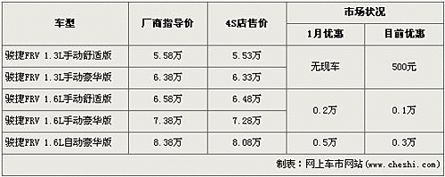 據(jù)經(jīng)銷商處銷售人員介紹,目前駿捷FRV在售的有五款車型,優(yōu)惠金額都分別有所下降。1.3L車型優(yōu)惠500元,1.6L手動(dòng)檔車型優(yōu)惠從2000元降到了1000元,1.6L自動(dòng)檔車型優(yōu)惠也從5000元降到了3000元。經(jīng)過優(yōu)惠調(diào)整后,1.6L手動(dòng)舒適型售價(jià)變?yōu)?.48萬元,1.6L手動(dòng)豪華版售價(jià)變?yōu)?.28萬元。全系最高配的1.6L自動(dòng)豪華型售價(jià)回升到了8萬元區(qū)間。