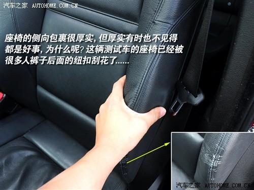 前排座椅的包裹性非常出色,特別是靠背兩側(cè)的包裹隆起很高,但我們也發(fā)現(xiàn)這種座椅的一點不足之處:側(cè)面很容易被褲子后兜的紐扣刮到,時間稍長就成了試駕車現(xiàn)在的樣子:真皮已經(jīng)被刮花了。
