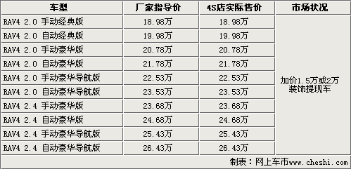 2009年4月10日,一汽豐田正式推出了首款SUV車型RAV4,售價18.98-26.43萬元。作為一款日系經(jīng)典城市SUV車型,起初以進口方式銷售時就得到了廣大消費者的喜愛,此次國產(chǎn)后由于價格較進口車型有所降低,進一步提升了RAV4的性價比。那么剛剛上市RAV4的市場狀況究竟如何呢?記者在走訪北京地區(qū)一汽豐田4S店時了解到:目前國產(chǎn)RAV4現(xiàn)車現(xiàn)已到店,但是由于貨源比較緊張,消費者需要加價1.5萬元或2萬元裝飾才可以提到現(xiàn)車。具體車型售價見下表: