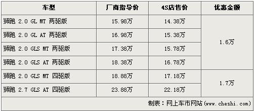 根據(jù)北京東風悅達起亞經(jīng)銷店銷售人員介紹,09款獅跑共分為6款車型,其中2.0L車型為5款,動力更強勁的2.7L車型為1款,目前09款獅跑全系都有優(yōu)惠,兩驅版車型優(yōu)惠1.6萬元,四驅版車型優(yōu)惠1.7萬元。經(jīng)優(yōu)惠后,入門級的手動2.0 GL兩驅版售價從15.98萬元下降到了14.38萬元。四驅版車型經(jīng)1.7萬元優(yōu)惠后,手動2.0L GLS版售價從18.88萬元降到了17.18萬元,而排量更大的自動2.7L GLS版售價從23.88萬元下降到了22.18萬元,F(xiàn)車方面,經(jīng)銷商處已有現(xiàn)車并且非常充足,消費者挑選的空間很大。