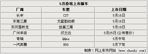 轟轟烈烈的2008上海車展將于今天正式閉幕,而車展上首發(fā)的新車、概念車讓人印象深刻,不過在亮相之后,他們最終都會量產上市。在即將到來的五月份就將有6款新車型上市,其中自主品牌繼車展后再唱主角,有3款新車型上市,分別為長豐CS7、奇瑞QQme及奔騰B50。