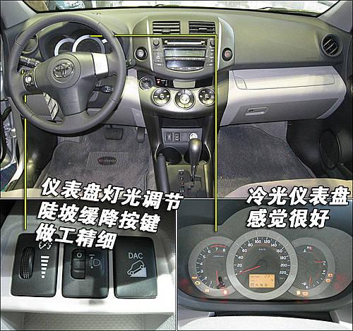 豐田國產(chǎn)RAV4凸顯出該車的運動風(fēng)格,在內(nèi)飾設(shè)計上采用深色設(shè)計。兩小一大的冷光儀表盤,感覺很舒服,駕駛員可以查看比較輕松。儀表盤燈光調(diào)節(jié)、陡坡緩降按鍵位于方向盤左側(cè),用料感覺相對比較精細(xì)。