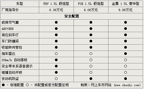在安全配置方面,三款車型都標(biāo)配前排雙氣囊、ABS+EBD、高位剎車燈、車門防撞梁這樣的基本配置,同時(shí)FRV還帶有20km/h自動落鎖、安全帶未系語音提示、碰撞自動開鎖這三個(gè)實(shí)用配置,但沒有配置發(fā)動機(jī)電子防盜。吉利金鷹是唯一配置倒車?yán)走_(dá)的車型,能為駕駛員泊車提供幫助。
