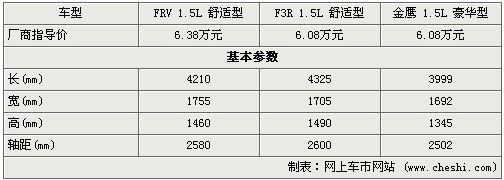 從基本參數(shù)來看,比亞迪F3R在車長及軸距在三款車中比較突出,相應(yīng)的內(nèi)部空間也將比較寬大些,而駿捷FRV稍次之但車身較高,頭部空間方面會比較好一些,而金鷹明顯要比他們小一號。