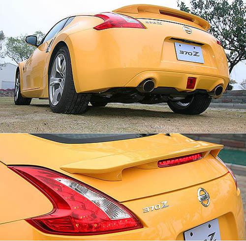 為了強(qiáng)化運(yùn)動氣息,標(biāo)準(zhǔn)版的370Z標(biāo)配后擾流尾翼;雖然造型不顯夸張,仍頗具畫龍點(diǎn)睛之效;而后保桿的造型也小有來頭:左右大口徑雙出尾管已是性能車不可或缺的身份表彰,設(shè)計(jì)師更在中央位置加入一組方型后霧燈。除了后霧燈的作用外,此一燈具在踩踏剎車時(shí)也會同步有反應(yīng),頗有模仿F1賽車雨天警示燈組的意味。