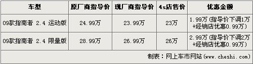 據(jù)經(jīng)銷商銷售人員介紹,09款指南者的官方廠商指導(dǎo)價下調(diào),運動版的售價從24.99萬元下降到了23.99萬元,限量版的售價從28.99萬元下降到了26.99萬元,并且經(jīng)銷商處還有優(yōu)惠,最高優(yōu)惠達到了2.99萬元。09款指南者運動版與限量版經(jīng)優(yōu)惠后,售價分別降為了23萬元和26萬元。銷售人員還介紹,指南者現(xiàn)車店內(nèi)比較緊張,錯過這批現(xiàn)車的消費者需交1萬元現(xiàn)金,下個月才可提車。