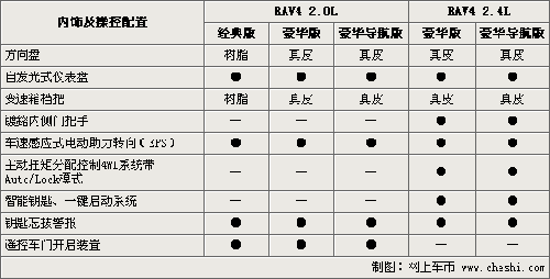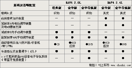 RAV4入門級(jí)車型的音響系統(tǒng)為單碟CD,豪華版車型為6CD連放,而導(dǎo)航版車型則配備了6.5英寸的寬屏液晶DVD語音電子導(dǎo)航系統(tǒng)并提供了藍(lán)牙免提裝置。此外,RAV4 2.4L車型與2.0L車型在功能方面的差異還在于,座椅的材質(zhì)、前排座椅的加熱裝置與駕駛席座椅調(diào)節(jié)的形式上。