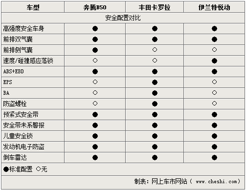在安全裝備上,奔騰B50五款車型采用的是同樣的配置,前排雙氣囊、駕駛員自動預(yù)緊安全帶、駕駛員安全帶未系報(bào)警等都為標(biāo)配,防炫目內(nèi)后視鏡、后門兒童鎖、間歇式寬幅雨刷都為保障駕駛安全設(shè)計(jì)。對比另外兩款車型則少了EPS以及BA等輔助安全系統(tǒng)。