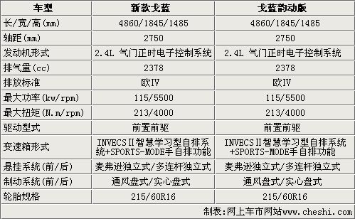 三菱全新戈藍(lán)和韻動版的整車尺寸為4860/1845/1485mm,軸距達(dá)到了2750mm,與雅閣、凱美瑞達(dá)到同一水平。新款戈藍(lán)和韻動版搭載2.4L發(fā)動機(jī),最大功率達(dá)到115kw/rpm,最大扭矩為213N.m/4000rpm.,匹配INVECSⅡ智慧學(xué)習(xí)型手自一體變速箱,并配備有換擋撥片功能。戈藍(lán)采用多連桿式后懸掛系統(tǒng),并采用前通風(fēng)盤式,后實(shí)心盤式制動系統(tǒng),使這款車更具操控性和安全性。