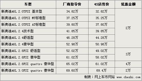 據(jù)4S店銷售人員介紹,目前新奧迪A6L現(xiàn)售的車型主要是黑色款,其他款顏色如銀色均需要預訂。訂金為1萬元,需要等待兩個月時間。消費者現(xiàn)在購車可以享受一定的現(xiàn)金優(yōu)惠幅度,其中2.0、2.4和3.0排量優(yōu)惠2萬元。2.8舒適型和豪華型優(yōu)惠3萬,2.8頂配車型可優(yōu)惠到4萬。