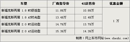據(jù)長安福特經(jīng)銷商處銷售人員介紹,兩廂新款?怂谷祪(yōu)惠1萬元。兩廂新款?怂狗譃1.8L和2.0L兩種排量,入門級車型的1.8L手動舒適版經(jīng)優(yōu)惠后,售價為10.89萬元。高配的2.0L自動運動版售價降到了14.39萬元。