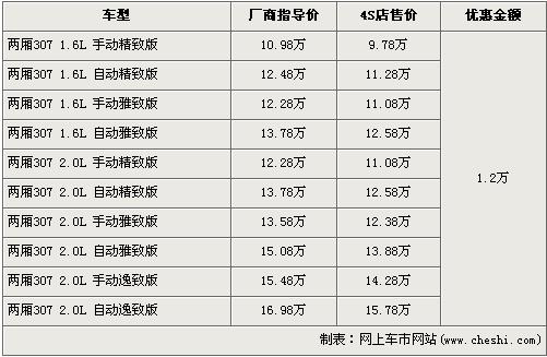據(jù)東風(fēng)標(biāo)致經(jīng)銷店銷售人員介紹,兩廂標(biāo)致307分為1.6L和2.0L兩種排量,目前優(yōu)惠1.2萬元,入門車型的1.6L 手動精致版原廠商指導(dǎo)價為10.98萬元,經(jīng)優(yōu)惠后僅售9.78萬元,排量稍大的2.0L排量的低配車型手動精致版經(jīng)優(yōu)惠后售價為11.08萬元,F(xiàn)車方面,1.6L車型現(xiàn)車充足,2.0L車型則現(xiàn)車緊張,挑選空間不大。