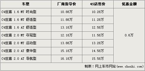 據(jù)經(jīng)銷商處銷售人員介紹,C4世嘉全系優(yōu)惠金額6000元。目前,C4世嘉全系最低配的1.6L手動時尚型售價從原廠商指導(dǎo)價10.88萬元降至10.28萬元,黑內(nèi)飾的2.0L手動運動型售價也降至到了13.28萬元。銷售人員還介紹,目前店內(nèi)現(xiàn)車以銀色、紅色為主。