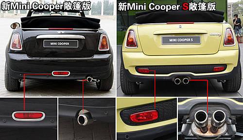 在車輛尾部,新一代Mini Cooper和Mini Cooper S敞篷版的差異也顯而易見。新一代Mini Cooper敞篷版的保險杠單霧燈和左側(cè)單排氣管設計,均被新一代Mini Cooper S敞篷版上的保險杠雙霧燈和中置雙排氣管所替代,而尾部“Cooper S”的LOGO就更不用說了。