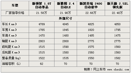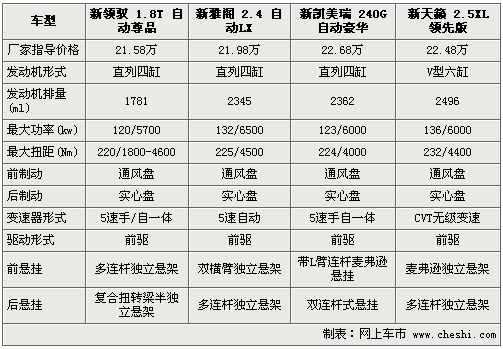 新領馭全系7款車型已于上月底正式上市,售價為16.98-30.38萬元。除前臉和尾部的全新設計外,老款1.8T引擎經過重新調教最大功率達120Kw。而在此中級車細分市場中,新雅閣、新凱美瑞和新天籟均占據(jù)著一定的市場份額。下面通過對四款價格相近車型進行詳實解析,以便為您的購車提供一定的參考。