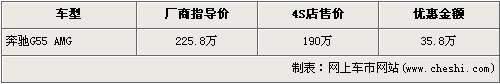 根據(jù)北京奔馳4S店銷售人員介紹,目前奔馳G55 AMG現(xiàn)金優(yōu)惠35.8萬(wàn)元。經(jīng)優(yōu)惠后,奔馳G55 AMG售價(jià)從廠商指導(dǎo)價(jià)的225.8萬(wàn)元下降到了190萬(wàn)元。銷售人員還介紹,目前店內(nèi)無(wú)奔馳G55 AMG現(xiàn)車,欲購(gòu)此車的消費(fèi)者需交訂金10萬(wàn)元,最早2個(gè)禮拜可提車。