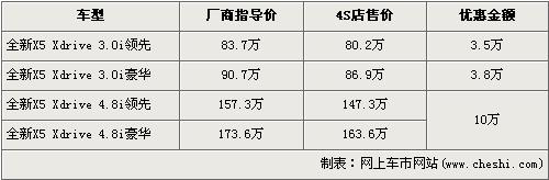 據(jù)經(jīng)銷商處銷售人員介紹,近期購買X5的消費者可以得到最高10萬元的優(yōu)惠。新款的寶馬X5 3.0i領先版車型和3.0i豪華版車型分別優(yōu)惠3.5萬元和3.8萬元。經(jīng)優(yōu)惠后,新X5 3.0i領先版和豪華版售價分別降為了80.2萬元和86.9萬元。前段時間沒有優(yōu)惠的新寶馬X5 4.8i車型目前出現(xiàn)了全系最高10萬元的優(yōu)惠。經(jīng)優(yōu)惠后,頂配的4.8i豪華版車型售價降到了163.6萬元,跌破了170萬。銷售人員還介紹,店內(nèi)目前沒有領先版車型現(xiàn)車,欲購買的消費者需交10萬元訂金,約等1個月后可提車。