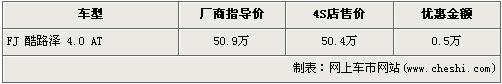 據(jù)廣州豐田4S店銷售人員表示,F(xiàn)J酷路澤已經(jīng)停止了進口目前在售的都是庫存貨,目前FJ酷路澤有5000元的優(yōu)惠,前段時間的3萬元優(yōu)惠已不復存在。經(jīng)優(yōu)惠后,F(xiàn)J酷路澤的售價從原廠商指導價50.9萬元下降到了50.4萬元。銷售人員還介紹,目前FJ酷路澤現(xiàn)車不多,多處商家已無現(xiàn)車,其顏色主要以黃色居多,欲購買者應快快出手。