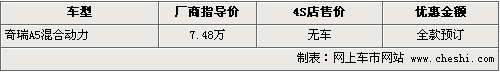 據(jù)4S店銷售人員介紹,奇瑞A5混合動(dòng)力車型目前銷量很少,但仍有少量夠買者。消費(fèi)者如果購車的話需要全款訂車,這款車的售價(jià)為7.48萬元。