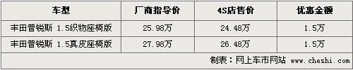 據(jù)4S店銷(xiāo)售人員介紹,目前普銳斯全系有兩款車(chē)在售,售價(jià)分別為25.98萬(wàn)和27.98萬(wàn)元,現(xiàn)在購(gòu)車(chē)的話可以優(yōu)惠現(xiàn)金1.5萬(wàn)元?钍胶皖伾惶R全,訂車(chē)的話周期比較長(zhǎng),需等大概2個(gè)月時(shí)間。