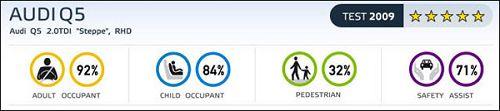 總成績,奧迪Q5在駕駛者保護(hù)上獲得92%較高的得分率,對于兒童的保護(hù)獲得84%的得分率,對于行人保護(hù)相對較低,僅獲得32%的得分率,安全輔助方面獲得71%的加分,最終獲得5星安全評價(jià)。