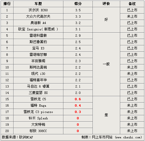 從上圖中的歐洲NCAP測試統(tǒng)計中可以看出,以安全著稱的沃爾沃確實有實力,XC60以3.5的高分位列第一名,緊隨其后的大眾新高爾夫和奧迪新A4,歐寶Insignia(即新君威)也獲得了3.1分,四款車都獲得了好的評價,其中除了新高爾夫即將國產(chǎn)之外,其他三款都已在國內(nèi)市場銷售。有好的就有差的,即將國產(chǎn)的雪鐵龍C5僅獲0.6分,而鈴木Splash、大發(fā)特銳、標致308CC意外的評為零分,在碰撞中毫無保護可言甚至可能會對頸部造成危險,而鈴木Splash還將在昌河鈴木投產(chǎn),不知到時能否獲得改進。