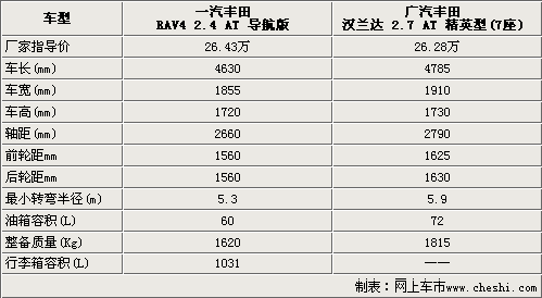 通過上表我們可以清楚的看出這兩款車型的外形尺寸情況,毋庸置疑,由于所處車型的級別不一樣,廣汽豐田漢蘭達在長、寬、高都要優(yōu)于一汽豐田RAV4的尺寸。同樣在軸距方面,漢蘭達達到了2790mm比RAV4長出了130mm,這就表明漢蘭達的內(nèi)部空間要明顯優(yōu)越于RAV4。在道路通過性方面要,由于RAV4身材小巧,轉(zhuǎn)彎半徑僅為5.3米,使其可以更好的適應中國道路的特點。油箱容積廣汽豐田漢蘭達達到了72升,而一汽豐田RAV4只有60升。
