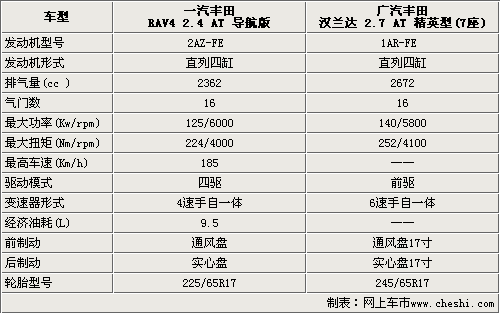 一汽豐田RAV4 2.4自動導航版和廣汽豐田漢蘭達2.7精英型7座這兩款車型都采用的是直列四缸的引擎,只是在發(fā)動機排量上不同。漢蘭達和RAV4的發(fā)動機都具有豐田獨步天下的VVT-i技術(shù),實現(xiàn)了卓越的動力輸出,同時進一步提高了燃油經(jīng)濟性。在變速器方面,RAV4就相對比較落后了,只采用了4檔自動變速器。而漢蘭達的6速手自一體變速箱則可以讓駕駛者充分的享受到駕駛的樂趣。一汽豐田RAV4和廣汽豐田漢蘭達都采用的是前通風盤式后實心盤式的剎車,但漢蘭達的剎車盤達到了17寸,可以更有效的降低剎車距離。
