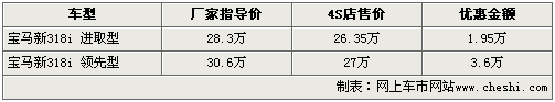 繼寶馬新318i領(lǐng)先型于年初正式上市后,售價(jià)為28.3萬(wàn)的寶馬新3系入門級(jí)車—新318i進(jìn)取型也于月初正式推出。寶馬新318i進(jìn)取型雖然上市還未滿月,但目前可以優(yōu)惠1.95萬(wàn)元,而寶馬新318i領(lǐng)先型最高降幅高達(dá)3.6萬(wàn)元。具體車型及價(jià)格如下表所示: