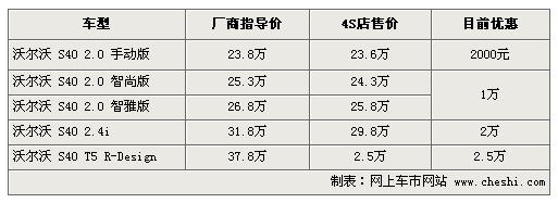 據(jù)4S店銷售人員介紹:目前沃爾沃S40優(yōu)惠幅度相比之前有所減少,2.0手動車型僅優(yōu)惠2000元,2.0 DSG車型最高優(yōu)惠1萬元,2.4車型與2.5T車型都達到2萬元的優(yōu)惠。不過目前手動車型無現(xiàn)車,訂車需等一個月。2.5T車型也較少,顏色并不齊全。相對而言,2.0自動檔與2.4車型現(xiàn)車較充足。