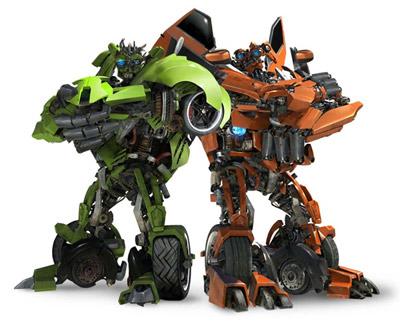 這對在《變形金剛2》中出現(xiàn)的“Twins”,實際上是“剎車”(Skids)和“擋泥板”(Mudflap)組成的二人組。剎車和檔泥板變形之后分別是雪佛蘭的Beat車和Trax概念車,兩個家伙抱在一起還能變成一個大機器人。為了組合起來比較協(xié)調(diào),他們的膀子都跟得了腦血栓一樣:不一樣長。剎車的右膀子更發(fā)達(dá),檔泥板的左膀子更強勁。