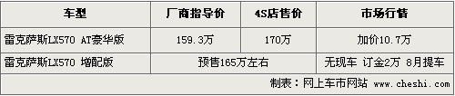 筆者目前從雷克薩斯經(jīng)銷商處了解,雷克薩斯LX570因產(chǎn)能有限,貨源供應(yīng)非常緊張。目前基本是訂單式銷售,而提現(xiàn)車的話加價金額則超過了10萬元。同時,雷克薩斯LX570增配版車型將于8月份到店,銷售人員介紹,增配版車型將增加智能副駕系統(tǒng),同時在內(nèi)飾和外觀上也有小幅的變化,預(yù)計售價在165萬左右。具體售價目前尚未公布,現(xiàn)在消費者訂車需要2萬元定金,一個月左右方可提車。