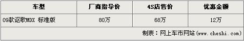 據(jù)經(jīng)銷商銷售人員介紹,09款謳歌-MDX的現(xiàn)金優(yōu)惠12萬(wàn)元,優(yōu)惠后售價(jià)也從原廠商售價(jià)80萬(wàn)降到了68萬(wàn),首次跌破了70萬(wàn)元。銷售人員還介紹,09款謳歌MDX增加的實(shí)用性的配件包括前下護(hù)板和后下護(hù)板,能避免惡劣路況對(duì)底盤帶來的損傷,并且09款謳歌MDX還新增了巴厘海藍(lán)和摩卡褐金兩種顏色,店內(nèi)現(xiàn)車非常充足,顏色也比較全,欲購(gòu)買者挑選的空間非常大。
