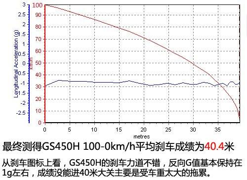 從剎車的工況圖表上看,GS450h的剎車力道始終保持的不錯,反向G值基本保持在1g左右的水平,成績沒能進40米大關主要是受車重太大的拖累。