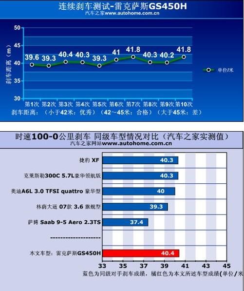 說到剎車,這款GS450h的100-0km/h的平均剎車成績?yōu)?0.4米,如果單從成績來看40.4米已經(jīng)很不錯,但如果考慮到它90萬元的售價,總覺得這么昂貴的車的剎車成績怎么也應該在40米之內才能讓人滿足。