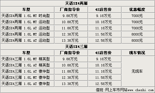 據(jù)長安鈴木4S店銷售人員介紹,全新天語SX4系列只有兩廂車型有現(xiàn)車銷售,三廂天語SX4則沒有現(xiàn)車。而兩廂天語SX4 1.6L車型目前最高可以優(yōu)惠7000元,1.8L車型最高可以優(yōu)惠8000元。另外,購買天語SX4 1.8L車型,還可以獲贈廠家所提供的半價購置稅優(yōu)惠。天語SX4三廂與兩廂車型的優(yōu)惠幅度一樣,但沒有現(xiàn)車銷售,只接受消費者預訂。