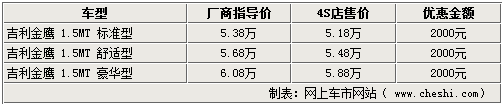 據(jù)北京地區(qū)吉利4S店銷售人員表示,吉利金鷹目前只有1.5手動(dòng)標(biāo)準(zhǔn)型有現(xiàn)車銷售,自動(dòng)版車型則沒有現(xiàn)車,暫不接受預(yù)訂,現(xiàn)在購買吉利金鷹手動(dòng)版車型,全系都可以優(yōu)惠3000元,在享受國家政策優(yōu)惠的基礎(chǔ)上更加具有吸引力。而全新的替代車型將屬于吉利的全球鷹品牌之下,車型代號(hào)為GC515,有望在明年年初推出。