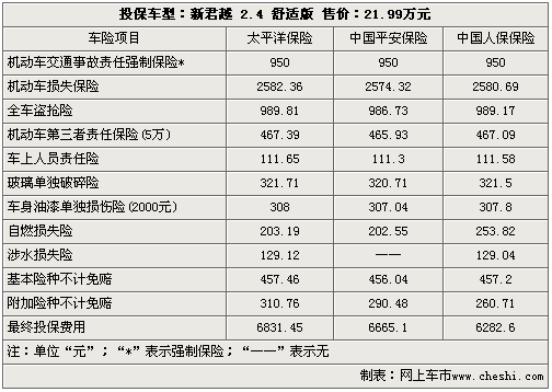 繼別克新君威上市后新一代君越也于日前正式投放國內(nèi)市場,全系5款車的售價為21.99萬-31.99萬。那么在購買別克新君越后,其保險又將如何選擇呢?下面我們將北京地區(qū)太平洋、平安、中保三家保險公司對新君越入門車型的投保費用進(jìn)行詳實解析,以便為您購車提供一定的參考。