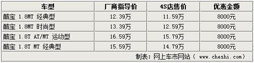 據(jù)4S店銷售人員介紹,此次酷寶系列車型涉及系列內(nèi)各款車型,1.8L手動(dòng)時(shí)尚型及1.8T自動(dòng)版運(yùn)動(dòng)型車型的現(xiàn)車各店最高可給出8000元的現(xiàn)金優(yōu)惠。而1.8T系列車型部分顏色需要訂購(gòu),優(yōu)惠幅度同樣可達(dá)到8000元;操控效果極佳的酷寶車型現(xiàn)車各店內(nèi)并不是非常充足,享受優(yōu)惠的同時(shí)仍需由經(jīng)銷商處進(jìn)行預(yù)訂購(gòu)買。購(gòu)車時(shí)商家還另外提供高檔裝飾贈(zèng)送,但不能折換現(xiàn)金。