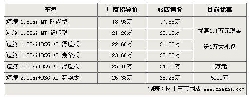據(jù)4S店銷售人員介紹:目前邁騰最高優(yōu)惠1.1萬(wàn)元,再送1萬(wàn)元裝飾套餐,其中包括9項(xiàng)升級(jí),總計(jì)優(yōu)惠可達(dá)2.1萬(wàn)元。目前邁騰現(xiàn)車充足,銷量最大的黑色車現(xiàn)車較多,并且邁騰全系均可享受1萬(wàn)元“大禮包”活動(dòng),但2.0Tsi車型優(yōu)惠幅度較小,建議購(gòu)買1.8Tsi車型。