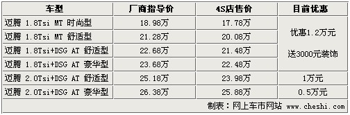 據4S店銷售人員介紹:目前邁騰最高優(yōu)惠1.2萬元,店內購車還可送3000元裝飾,裝飾包括地膠、腳墊、汽車防爆膜等。目前邁騰現車充足,1.8Tsi車型銷量較好,所以車源較為豐富,但2.0Tsi豪華型無現車需預定,預定需等20天左右。由于2.0Tsi兩款車型銷量較少,所以優(yōu)惠幅度較少,如果您對動力性要求不是非常高的話,1.8Tsi車型可以滿足您的需求,建議購買。