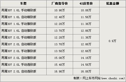 據(jù)東風(fēng)標(biāo)致經(jīng)銷店銷售人員介紹,兩廂標(biāo)致307分為1.6L和2.0L兩種排量,目前全系優(yōu)惠9000元,入門車型的1.6L 手動精致版原廠商指導(dǎo)價(jià)為10.98萬元,經(jīng)優(yōu)惠后僅售10.08萬元,排量稍大的2.0L排量的低配車型手動精致版經(jīng)優(yōu)惠后售價(jià)為11.38萬元。