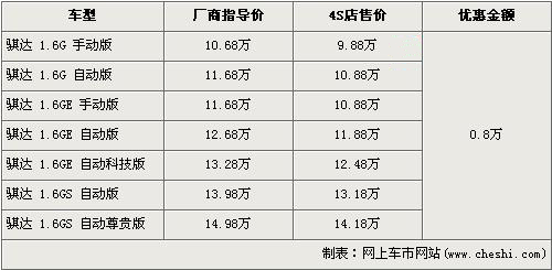 據(jù)東風(fēng)日產(chǎn)4s店銷售人員介紹,目前東風(fēng)日產(chǎn)騏達(dá)全系優(yōu)惠9000元。經(jīng)優(yōu)惠后,入門級(jí)的1.6G手動(dòng)版售價(jià)下降到了9.88萬元,而全系最高配的1.6 GS自動(dòng)尊貴版售價(jià)也降到了14.18萬元。銷售人員還介紹,目前店內(nèi)沒有騏達(dá)現(xiàn)車,欲購買者需交2000元訂金約等1個(gè)月時(shí)間。