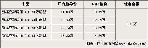 據(jù)長安福特經(jīng)銷商處銷售人員介紹,目前購買兩廂?怂沟南M者可以得到1.1萬元的優(yōu)惠。兩廂新款?怂狗譃1.8L和2.0L兩種排量,入門級車型的1.8L手動舒適版經(jīng)優(yōu)惠后售價下降到了10.79萬元。而高配的2.0L自動運動版售價同樣也降到了14.29萬元。