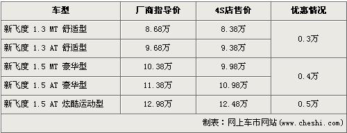 據(jù)廣州本田北京地區(qū)4S店銷售人員介紹,新飛度 1.5L炫酷運(yùn)動版的優(yōu)惠金額為5000元。新飛度在售車型分為1.3L及1.5L共5個(gè)車型在售,1.3L車型優(yōu)惠金額為3000元。1.5L豪華版的手動和自動車型經(jīng)4000元優(yōu)惠后,現(xiàn)售價(jià)分別為9.98萬元和10.98萬元,1.5L炫酷運(yùn)動版的優(yōu)惠5000元,現(xiàn)售價(jià)為12.48萬元。