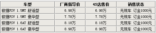 經(jīng)銷商透露,現(xiàn)在各店內(nèi)的FSV基本為展車或已被客戶預(yù)訂的車輛,基本沒有現(xiàn)車可以滿足消費(fèi)者的需要,消費(fèi)者如需購買可以繳納1千元訂金后等待一個(gè)月左右即可提車。由于駿捷FSV為剛剛上市的新車,所以店內(nèi)沒有任何形式的優(yōu)惠,請消費(fèi)者諒解。
