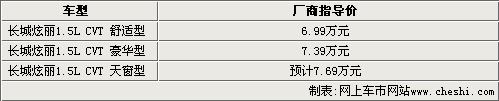 據(jù)悉,長(zhǎng)城炫麗CVT將在9月2日上市,首先會(huì)推出三款車型,其中1.5L舒適型和1.5L豪華型的售價(jià)分別為6.99萬(wàn)元和7.39萬(wàn)元。因?yàn)殪披愜囆鸵恢本蜎]有出天窗版,所以1.5L CVT 天窗版的價(jià)格還不明朗,預(yù)計(jì)在7.69萬(wàn)元左右。目前炫麗CVT已經(jīng)有部分現(xiàn)車抵達(dá)4S店,但因?yàn)樾萝噦浒冈虿荒苌吓,目前只能夠接受預(yù)訂。